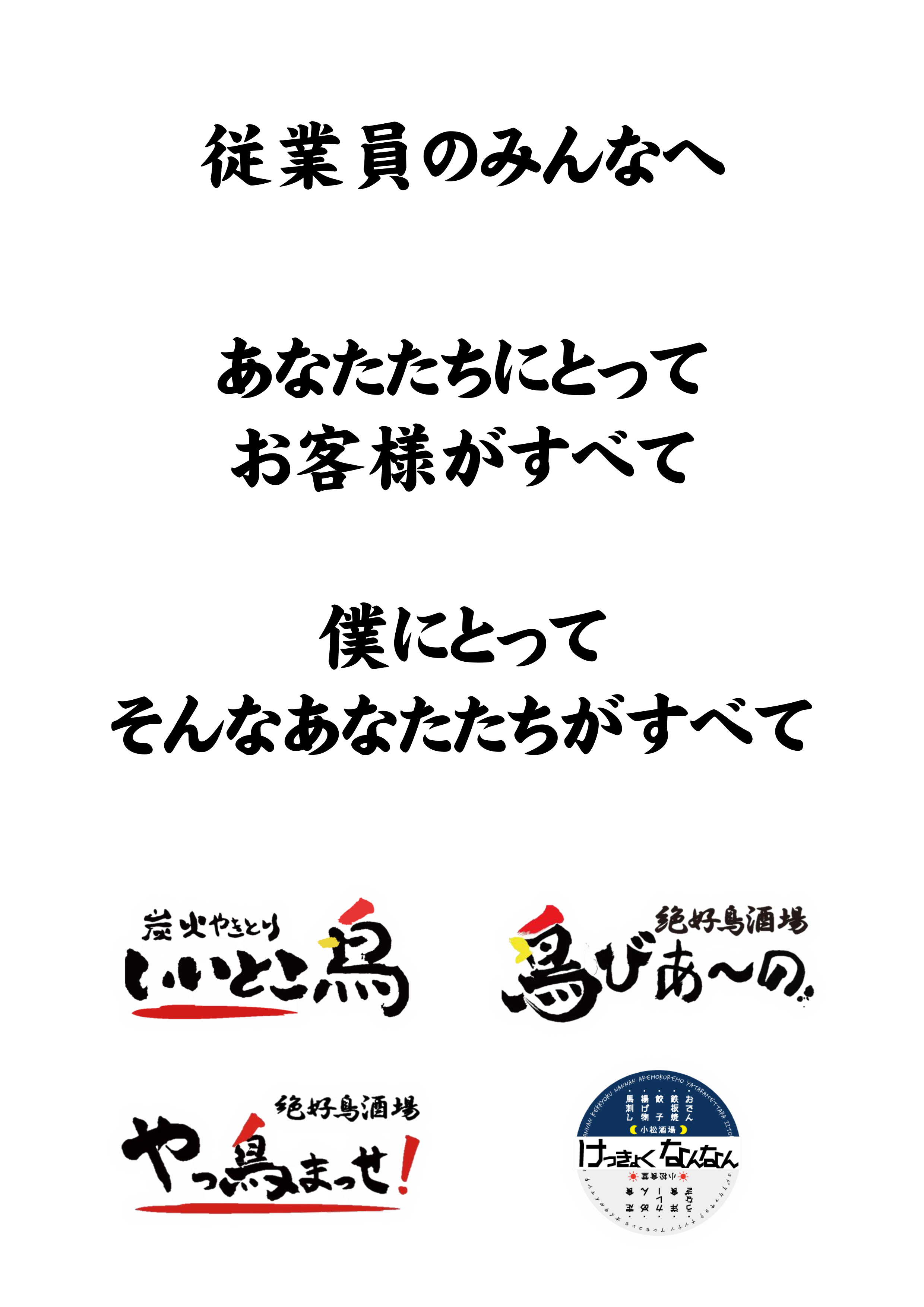 私たちが掲げるモットーの一部ですが、美味しいは当たり前の上で、「人」に特化した営業スタイルで、地域やお客様に愛されるお店作りにチャレンジしてきました。現在は社員メンバーへの暖簾分けや、社員メンバーから意見を募った新規事業などにも力を入れており、「人の夢を応援できる会社」であり続けたいと思っています。